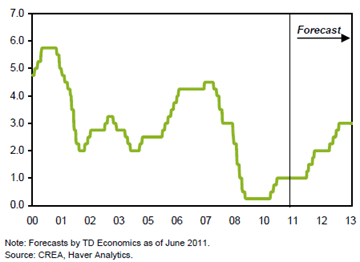 Here’s TD’s latest rate forecast for you variable mortgagors looking for a light in the dark. TD says: “We expect the tightening of monetary policy to now begin in January 2012. Gradual increases thereafter will take the overnight rate to 2.00% next year. After pausing to reassess the situation, the central bank is posed to further lift the rate to 3.00% by mid-2013.”It’s an understatement to say that this forecast is subject to change. But, if you assume these numbers are near the money, you’ll find that 5-year fixed and variable rates are neck and neck in terms of hypothetical interest cost over five years.- TD suggests that variable-rate payments will rise $110 per $100,000 of mortgage, based on its 200 bps rate hike projection.