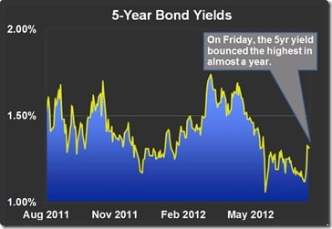 On Friday, the 5-year government yield popped 12 basis points—the biggest one-day increase in almost a year. When that sort of thing happens near lows, after a long downtrend and a period of sideways trading, it often marks a noteworthy change in market sentiment.