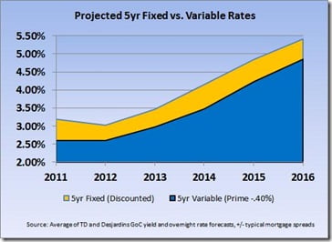 ¹ Desjardins’ forecasts are based on annual average rates. We’ve extrapolated those rates into year-end forecasts. That helps us average them with TD’s numbers. The 5-year fixed rate in the charts is based on a 150 basis point spread above the government of Canada 5-year bond. The 5-year variable is based on prime rate, less a 40 basis point discount. Since TD and Desjardins don’t forecast past 2016, our hypothetical term comparisons assumes that rates plateau in 2017.