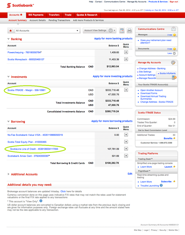 Scotia’s solution eliminates a step required by some competitors, which make you first move money from the LOC to a chequing account, and then transfer it to your investing account. This convenience matters since leveraged investing strategies require regular funds transfers.