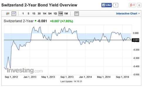 As just one example, observe this chart of the Swiss 2-year government bond. It’s been underwater (with a yield below zero) for several quarters.