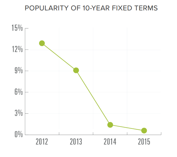 - Less than 1% of requests in 2015 were for 10-year fixed terms, down dramatically from 13% in 2012. It would help if lenders priced more aggressively on 10-year terms, but 10-years are disproportionately expensive to fund/securitize and manage (since borrowers can escape after five years with just a 3-month interest penalty).