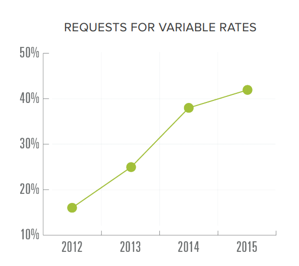 Notably, variable rate searches reached a four-year high last year. 42% of all RateHub.ca user requests in 2015 were for variable rates, up from 15% in 2012.