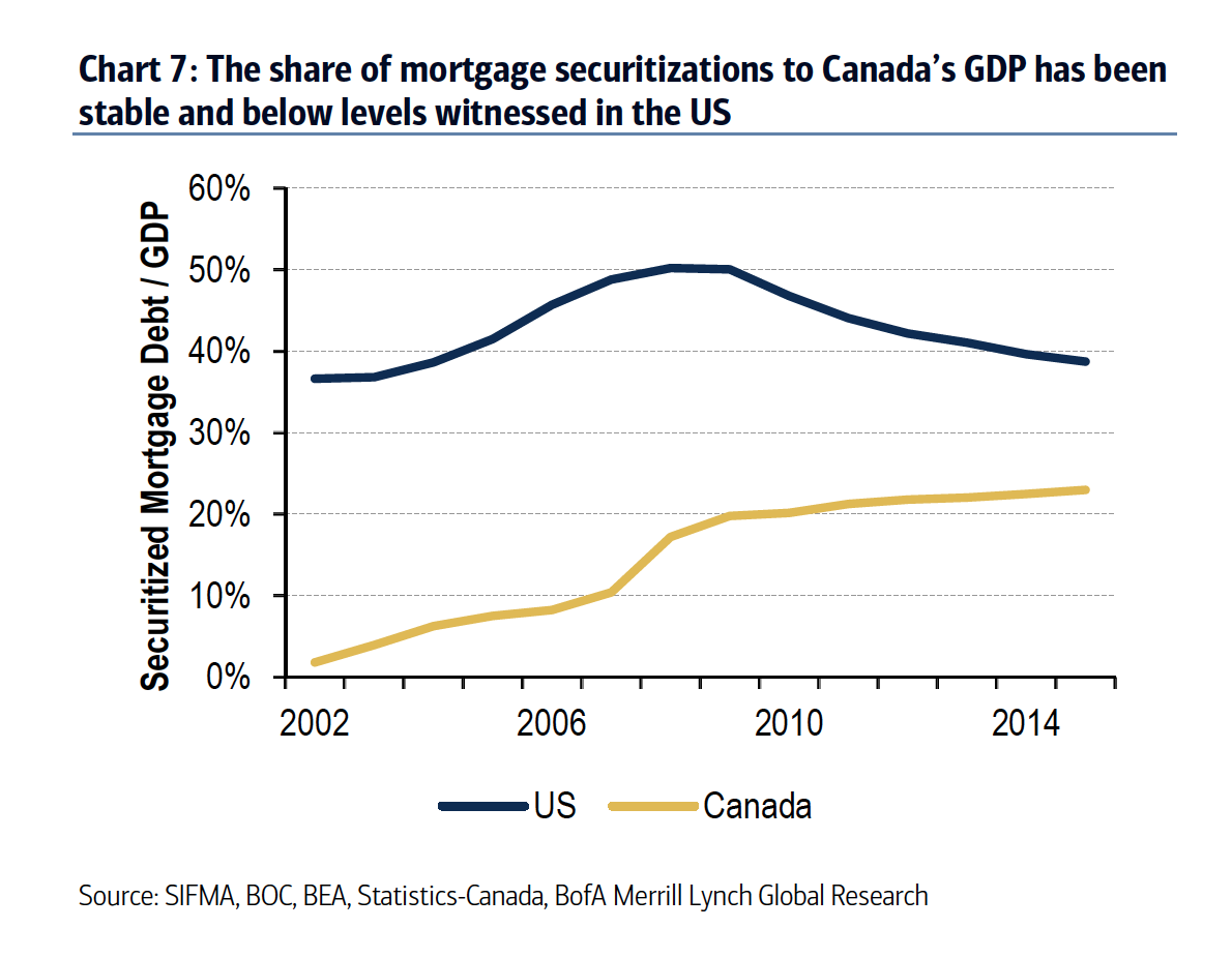 Risky mortgage securitization was blamed for feeding the U.S. housing crisis. In comparison, not only is Canadian MBS regulated far more rigidly than that toxic American MBS of old, but our overall securitization share of mortgage finance remains well below U.S. levels (although the gap is narrowing).