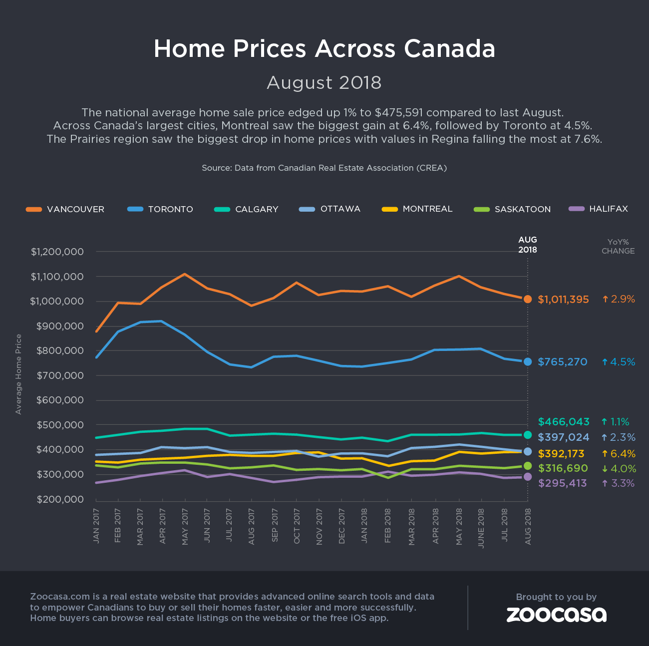 Montreal is the Canadian city that saw the fastest price growth this August, rising 6.4% to about $392,000. Next is Toronto, up 4.5% to $765,000. Vancouver rose 2.9% to an average of around $1 million, maintaining its position as the most expensive place to buy a home in the country. The Prairies saw slight declines across all markets, while Halifax rose 3.3% to about $295,500.