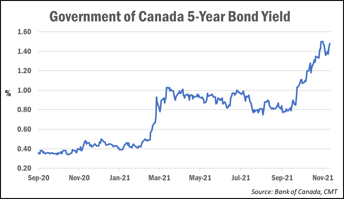 Bond yields started to rise in September at the first hint of hawkish sentiment from the Bank of Canada. This included signals that the Bank would end its bond-buying program (Quantitative Easing), which had been in place throughout the pandemic to add liquidity to financial markets, and guidance that interest rates would start to rise sooner than expected in 2022 (among other economic indicators).