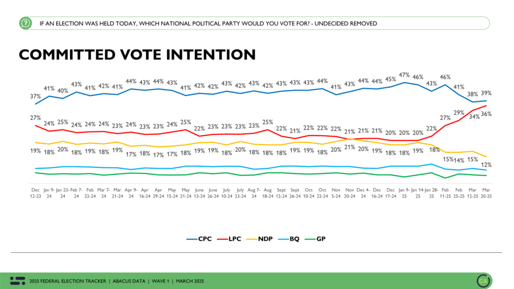 A new survey from Abacus Data shows the Conservatives holding a narrow lead with 39% support, followed by the Liberals at 36%. The NDP trails at 12%, its lowest level since Jagmeet Singh became leader.