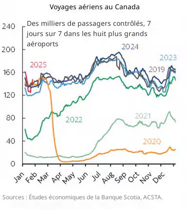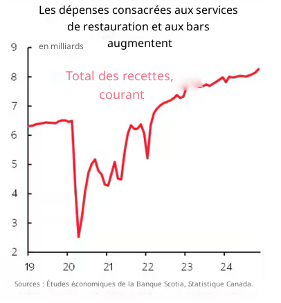 Pour ce type de dépenses, nous devons nous tourner vers d’autres sources, comme le rapport de Statistique Canada sur les dépenses dans les restaurants et les bars (graphique illustré à droite), qui montre que « les niveaux sont robustes et la tendance récente est à la hausse ». M. Holt fait également référence aux statistiques du transport aérien de 2024 (graphique illustré à droite), qui ne sont pas non plus incluses dans le rapport sur les ventes au détail.