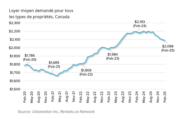 Depuis février 2024, le loyer moyen au Canada a baissé de 105 $ par mois, une chute plus importante que celle de la pandémie entre février 2020 et février 2021. À l’inverse, les loyers avaient augmenté de 209 $ par mois entre février 2023 et février 2024.