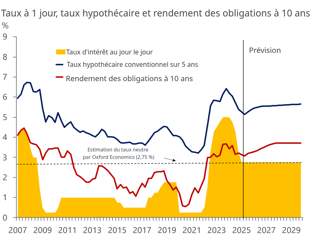 Les économistes d’Oxford anticipent un taux directeur figé à 2,75 % malgré la récession. Cette stabilité tranche avec les cycles passés où les ralentissements déclenchaient des baisses marquées. La prudence s’impose pour la Banque centrale : l’inflation menace de rebondir à 3 % fin 2025, tirée par les tensions commerciales et tarifaires.