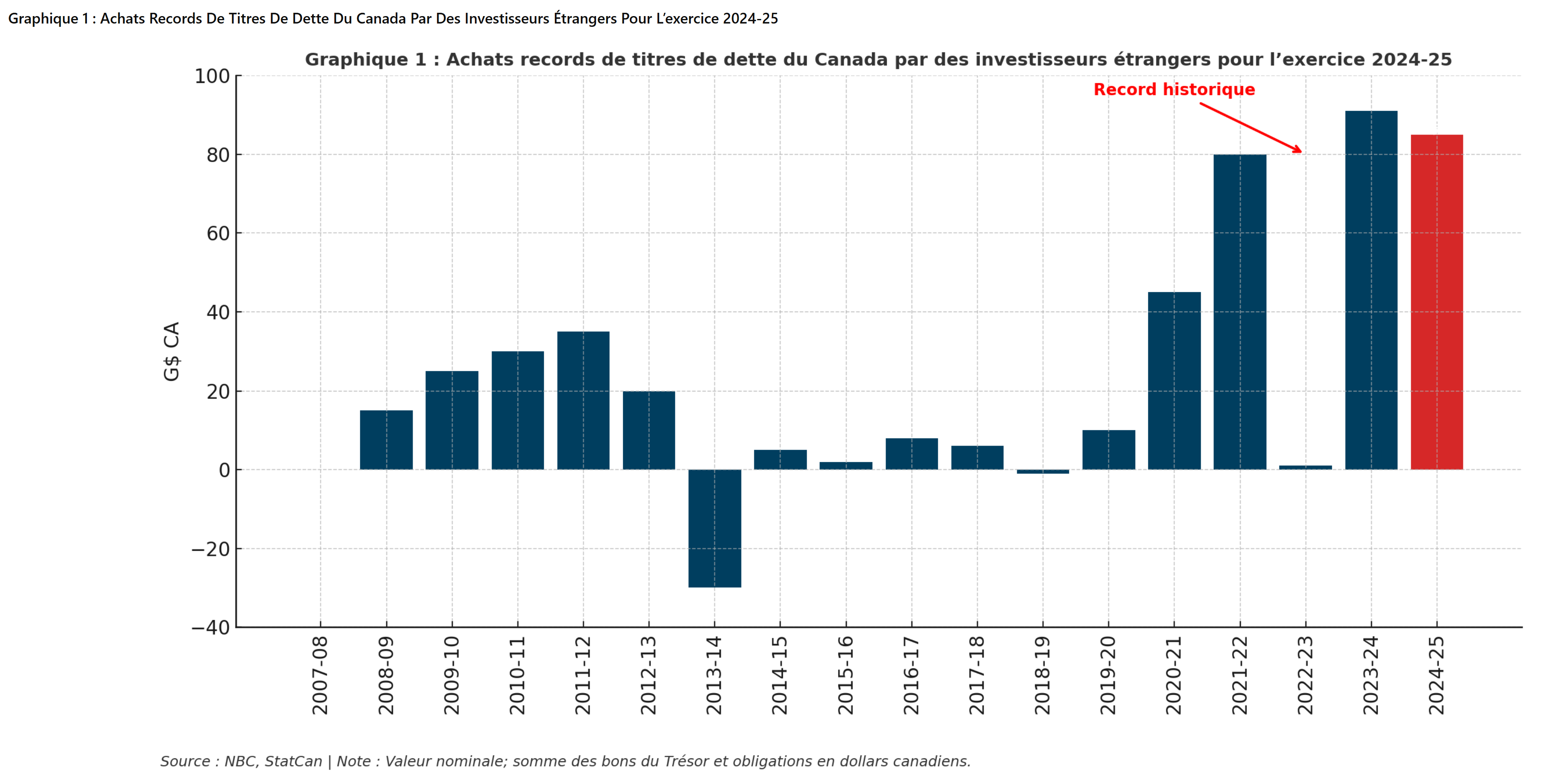 C’est un montant record — 91 milliards de dollars de bons du Trésor et d’obligations canadiens achetés par des non-résidents sur 12 mois — et suffisant pour soulever de sérieuses questions sur qui soutient réellement les besoins d’emprunt d’Ottawa.