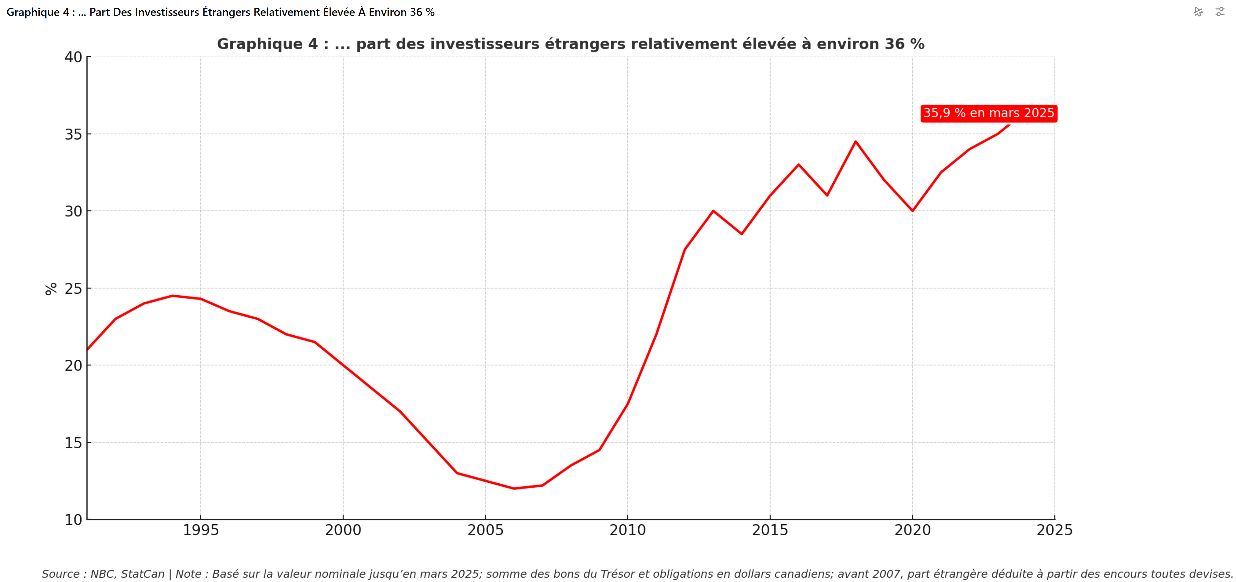 Les non-résidents détiennent une part croissante de la dette fédérale. Les investisseurs étrangers possèdent désormais 512 milliards de dollars d’obligations gouvernementales canadiennes, représentant 36 % de l’encours total. Ce pourcentage dépasse largement la moyenne historique de 23 % et frôle le sommet historique de fin 2024.
