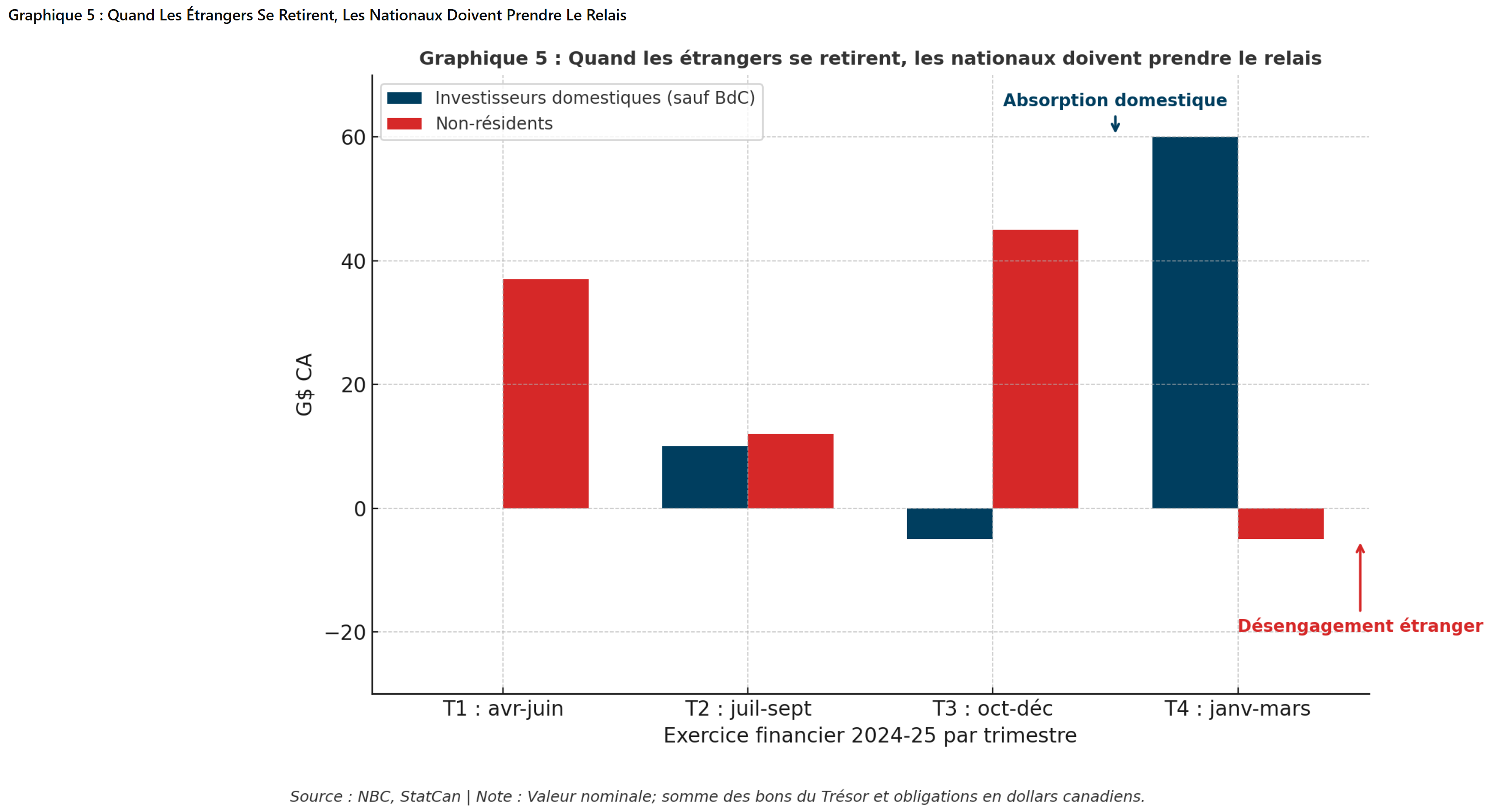 Entre janvier et mars 2025, les non-résidents n’ont acquis aucune nouvelle dette fédérale. Les investisseurs canadiens ont donc absorbé l’intégralité des émissions d’Ottawa, atteignant un niveau record depuis la vague d’emprunts au plus fort de la pandémie en 2020.
