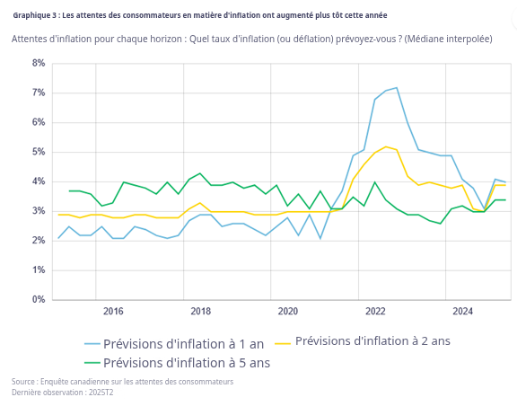 Bien que l’inflation générale diminue, les consommateurs s’attendent à une hausse de l’inflation dans le futur. « Avec tout ce qu’on dit sur les tarifs, les attentes d’inflation des consommateurs pour l’année ou les deux prochaines ont récemment augmenté, » a souligné Mme Kozicki, mettant en avant l’incertitude persistante comme un facteur clé qui maintient ces attentes à un niveau élevé.